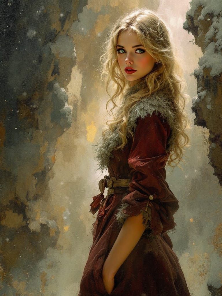 This image shows a full-body portrait of a 1950s pin-up woman in a maroon winter dress, with bold eye contact. Rendered with oil painting techniques, it features idealized naturalism and atmospheric backgrounds.