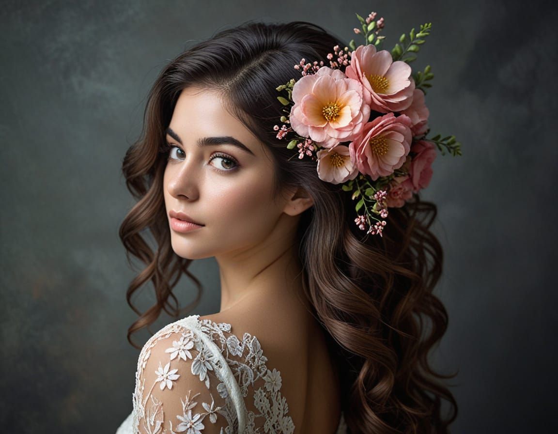 A striking picture of a young girl with curly hair playing a flower-adorned guitar. Rendered as an impasto oil painting, the work features textured floral patterns and luminous skin tones, capturing a pop star aesthetic.