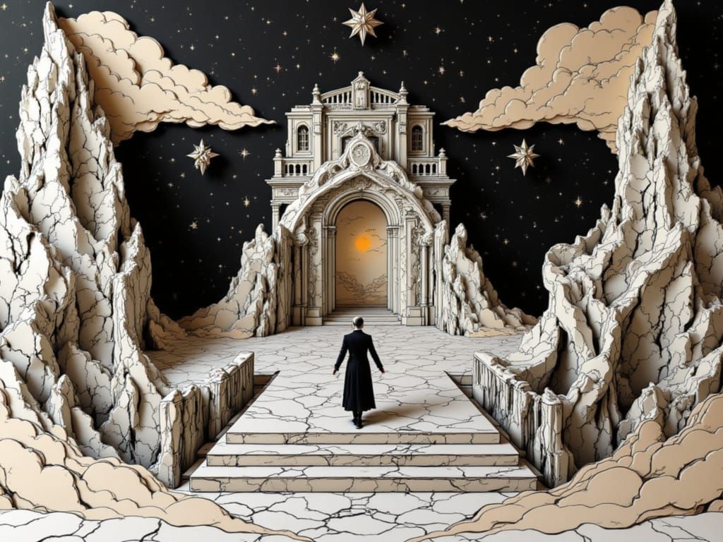 This image depicts a disorienting, three-dimensional paper diorama with M.C. Escher-inspired architecture. It features ripped paper elements and a black and white geometric design, creating a tunnel-like effect.