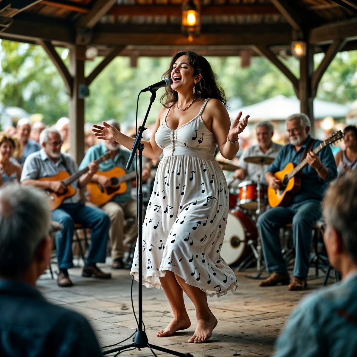This image shows a vibrant outdoor concert scene with an older rock band performing. A woman in a sundress sings to a crowd of cheering fans in this detailed and colorful photorealistic image.