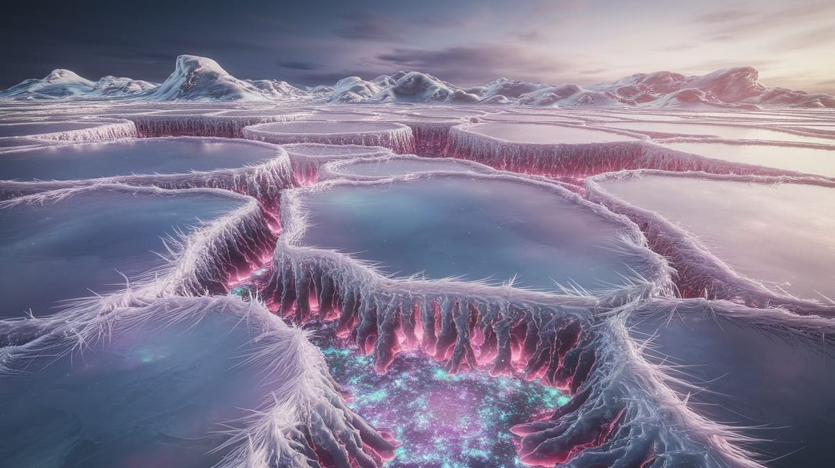 This image shows an awe-inspiring alien landscape with luminous iridescent frost and bioluminescent flora. The crystalline formations and fractured terrain create a surreal, otherworldly scene with spectral hues.