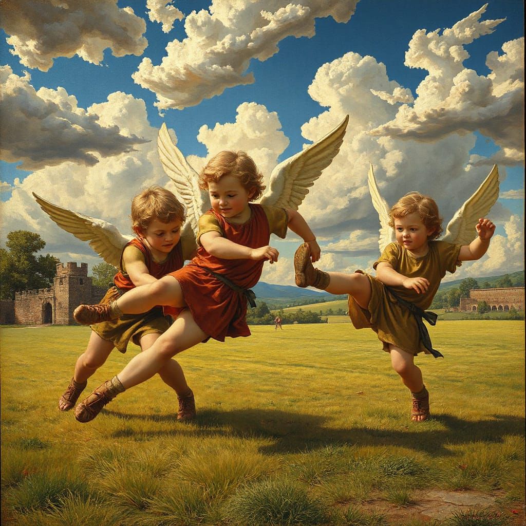 This image depicts cherubs playing rugby in rustic jerseys within a dreamy landscape. The artwork combines Byzantine mosaic and Renaissance fresco styles, featuring vibrant colors and dynamic action.