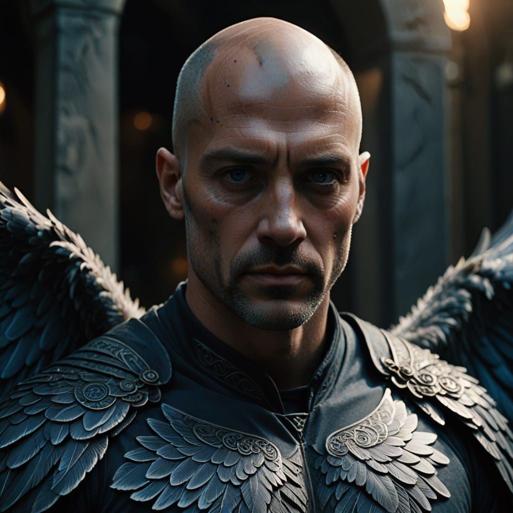 A striking picture of a bald, blue-eyed, middle-aged fallen angel. The figure features glowing blue runic tattoos, large feathered wings, and wears a grey robe in a cinematic style.