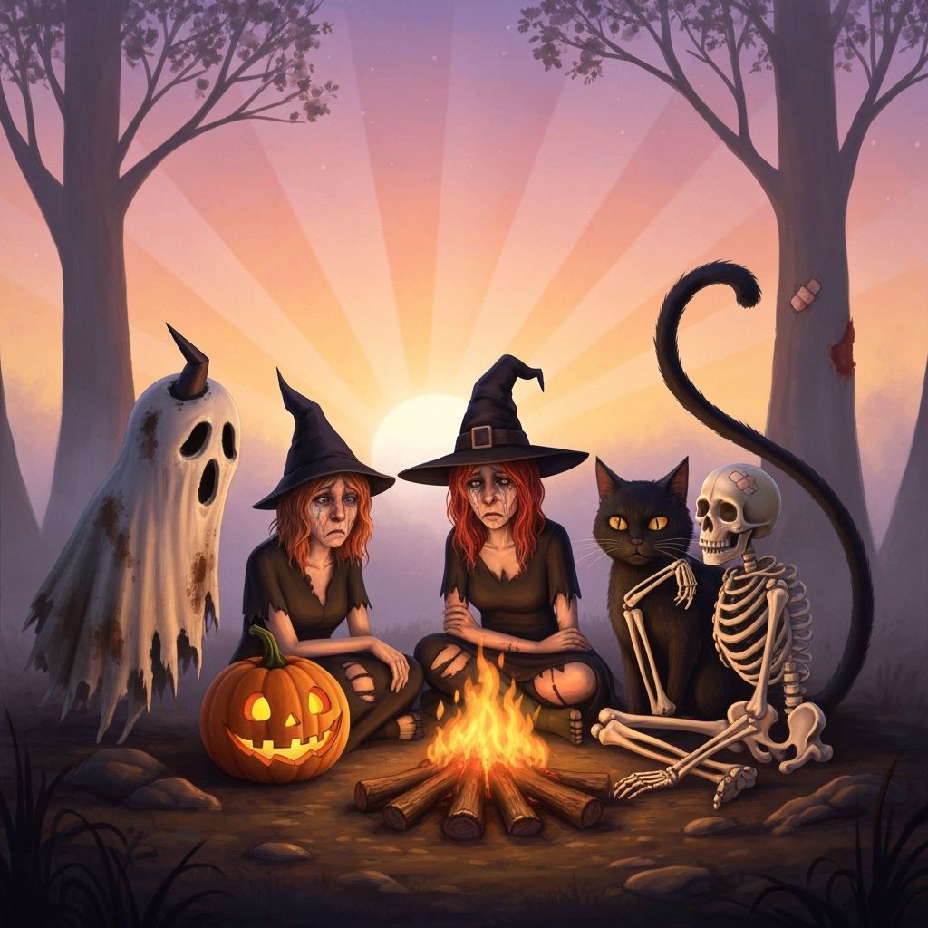 This image depicts a group of disheveled Halloween characters around a campfire at sunrise. Soft, pastel sun rays illuminate the sad, ethereal scene, rendered in an airbrush art style.