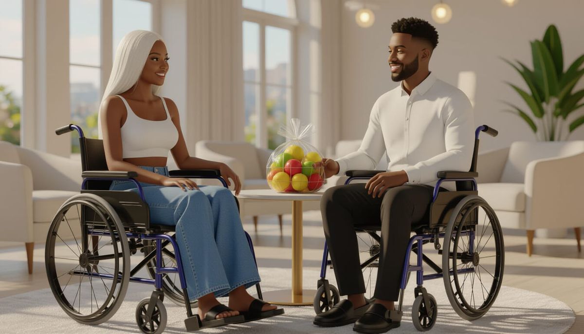 This image shows a beautiful African woman with white hair in a wheelchair, with an African man holding fruit. Rendered in a hyperrealistic animated style with cinematic lighting and deep shadows.