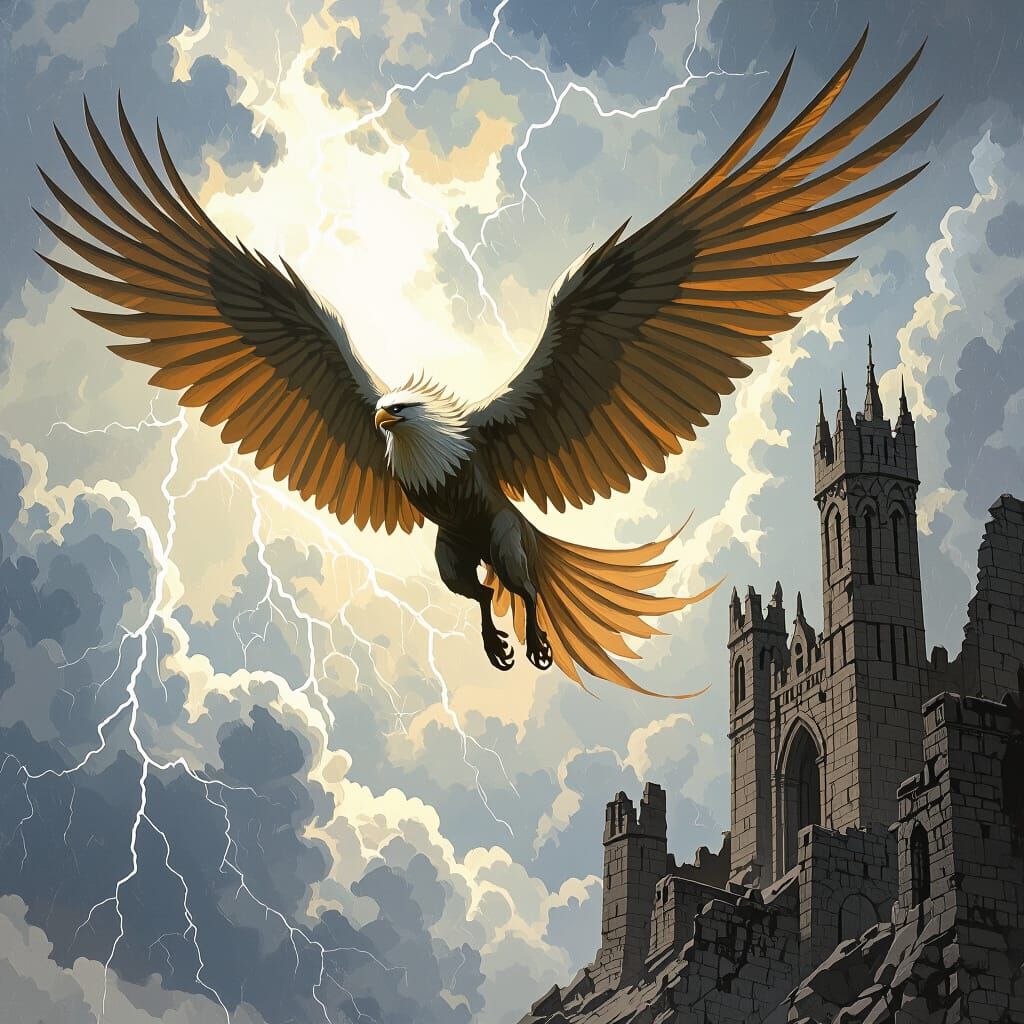 A majestic griffin soars through a stormy sky above a ruined gothic castle. The image features dynamic brushstrokes and cinematic lighting, with industrial details, in a dramatic style.