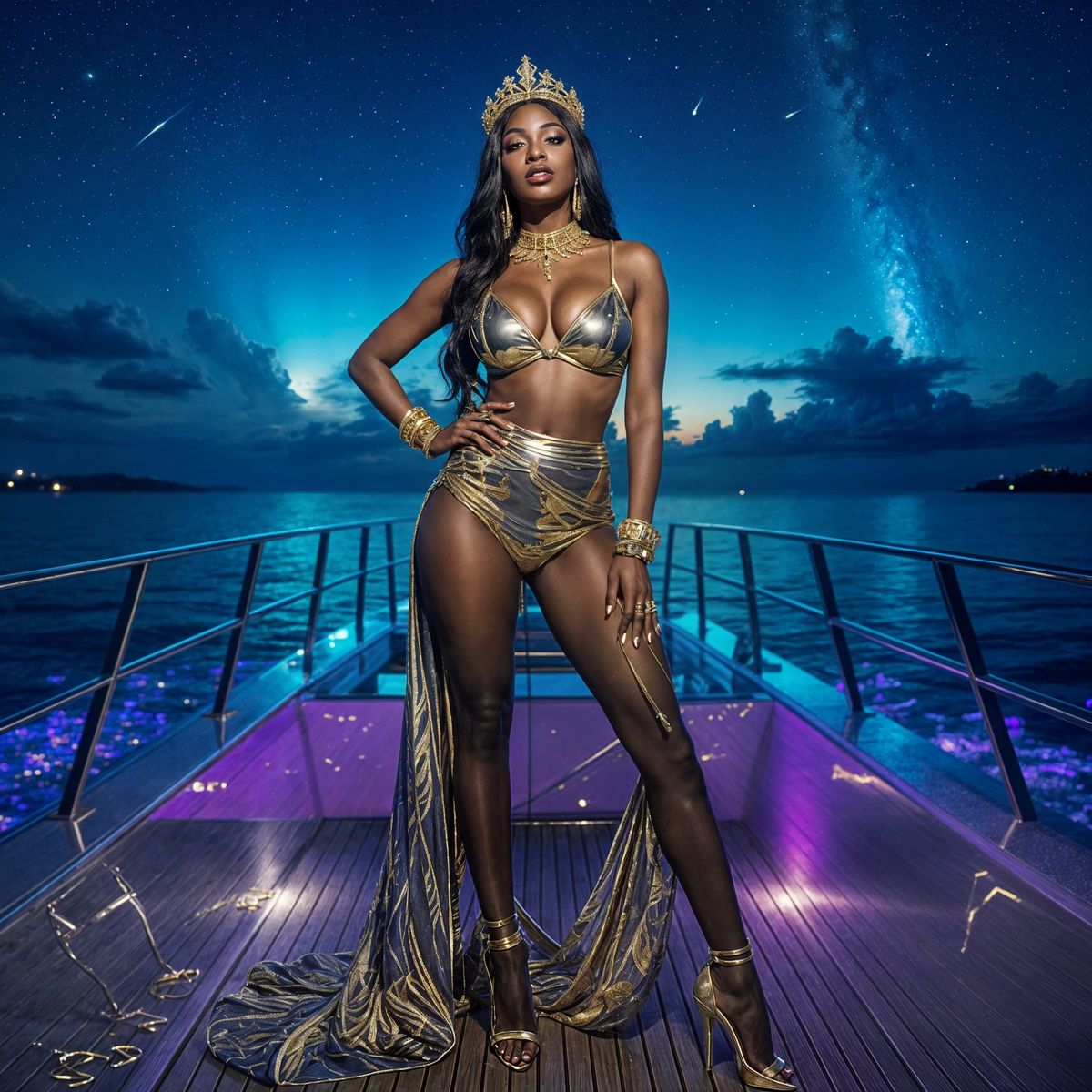 A striking picture of a voluptuous transgender woman standing on a futuristic yacht at night. She is adorned with gold jewelry and makeup, set against a backdrop of bioluminescent water and a vibrant aurora. The image is photorealistic.