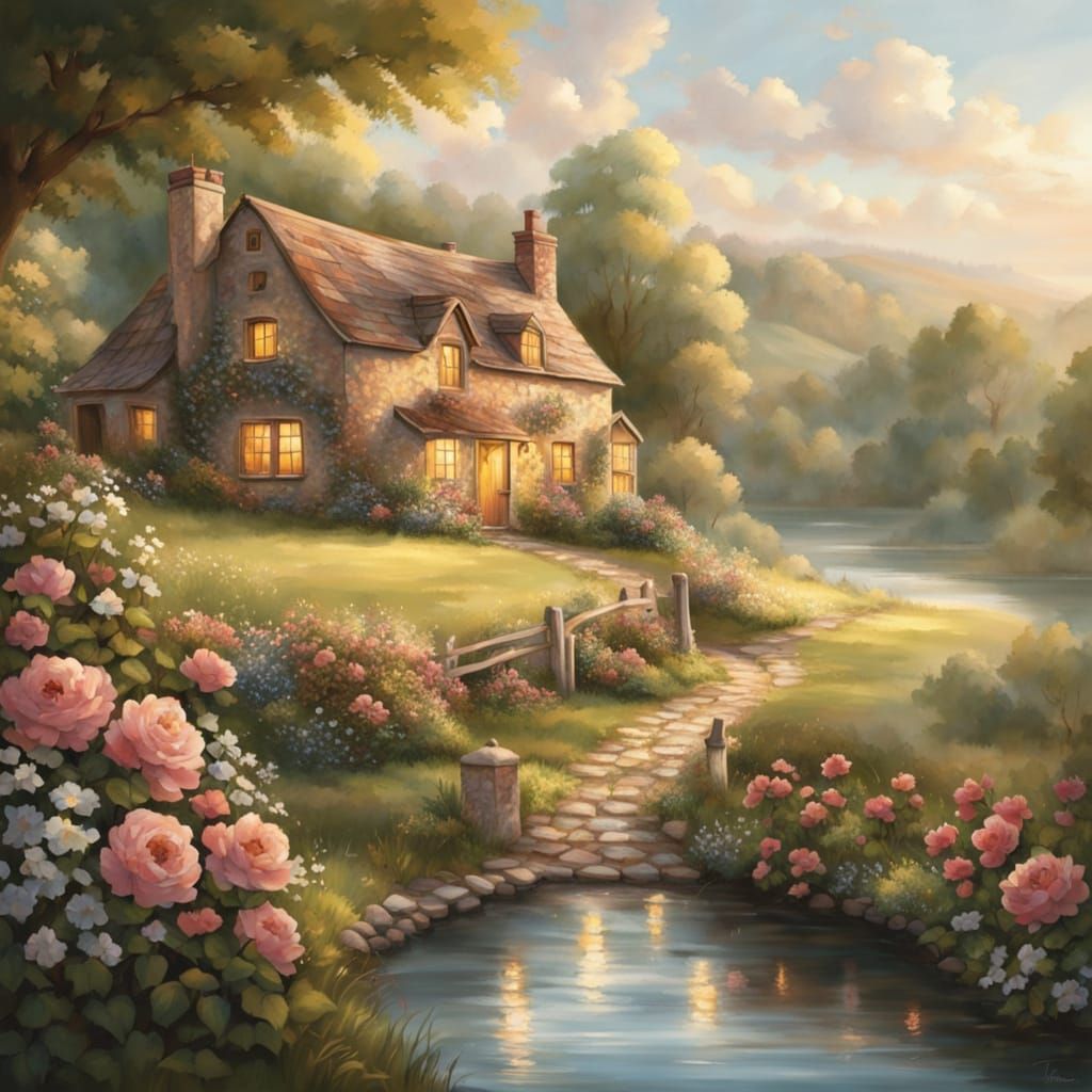 This idyllic scene captures the essence of a peaceful countryside retreat, with a weathered stone cottage nestled among lush greenery, climbing roses, and a meandering stream, evoking a sense of tranquility and warm, inviting light reminiscent of a cherished memory or storybook illustration.