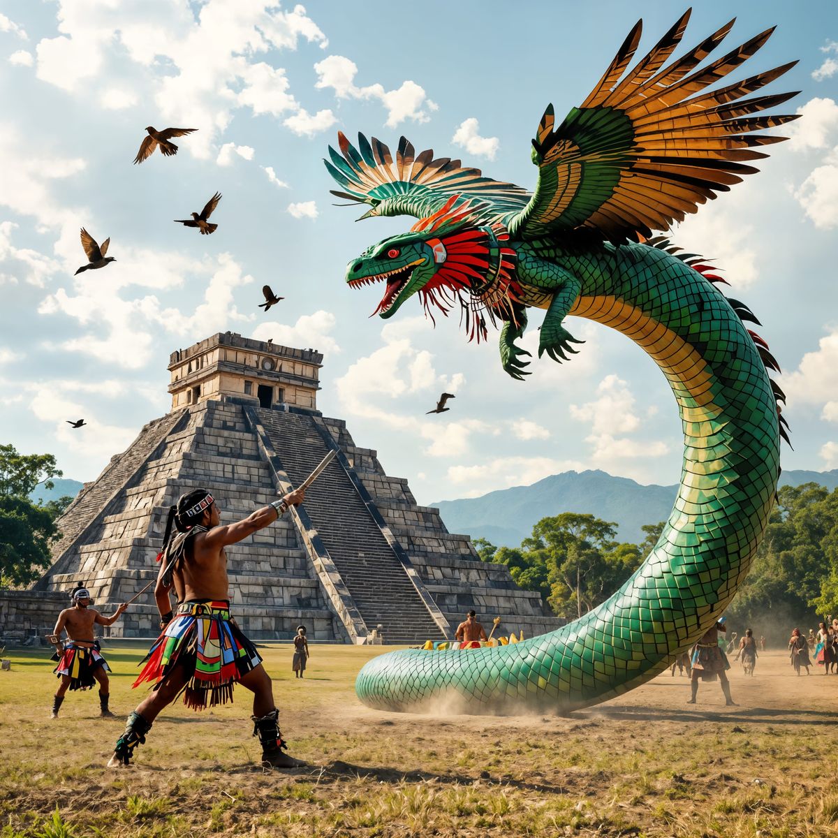 A vibrant image of the feathered serpent Quezacotl battling Aztec warriors before a jungle pyramid. The scene is depicted with sharp focus, bokeh effects, and cinematic studio lighting.