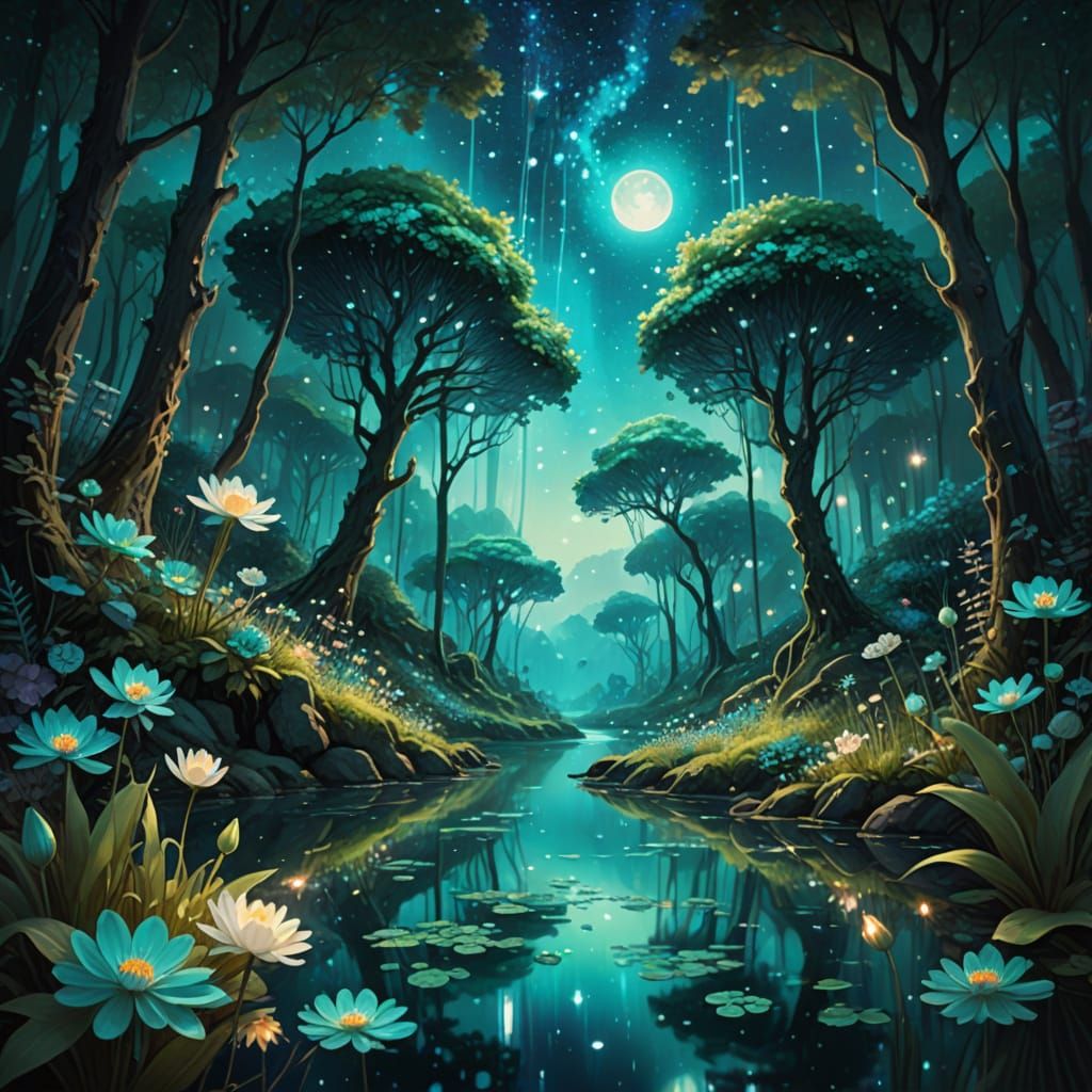This image shows a dreamy flower forest beneath a starlit sky, reflected in still water. The scene is rendered as a matte oil painting featuring ethereal lighting and soft focus.