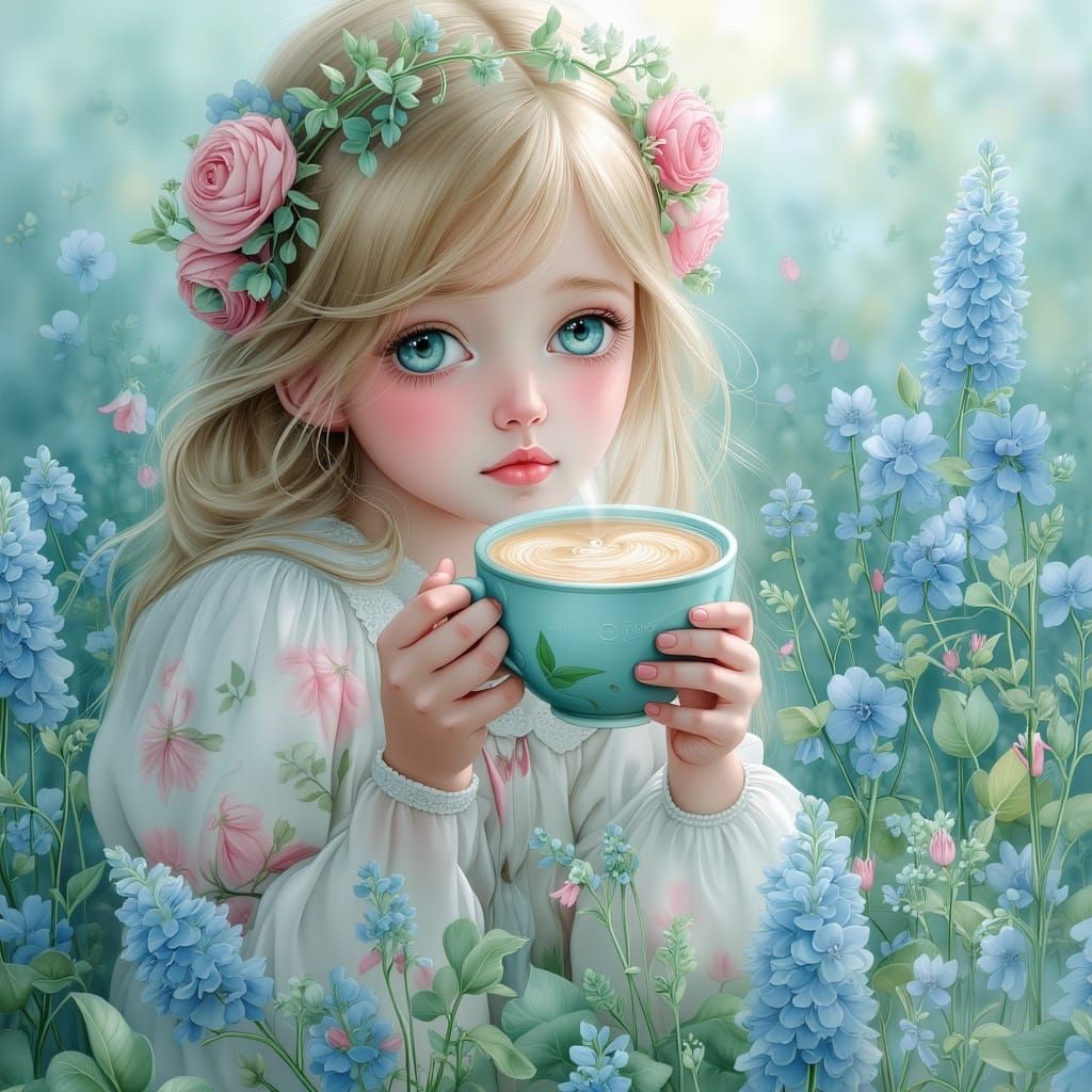 This image shows a beautiful woman holding coffee in a field of blue wildflowers, created in a soft, dreamlike digital painting style with pastel teal and coral colors.