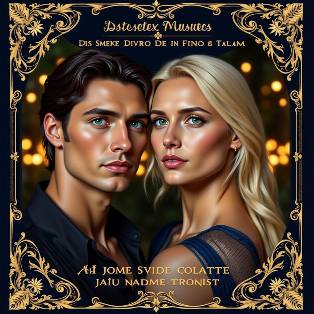 A romantic Art Nouveau-inspired portrait of a couple on a twilight Seine river cruise in Paris, featuring gold and midnight blue hues and cinematic lighting.