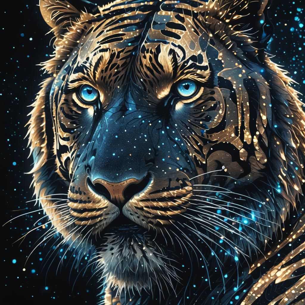 A striking picture of a tiger silhouette composed of glowing blue fireflies against a dark background. The image is a hyperrealistic, 3D digital art piece with intricate details and dramatic lighting.
