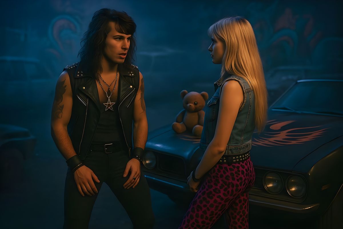 This image captures a cinematic, hyperrealistic scene at a spooky 80s junkyard. A heavy metal couple stands amidst eerie blue-purple lighting, with a teddybear on a Pontiac Firebird. The style is highly detailed with film grain and dramatic contrast.
