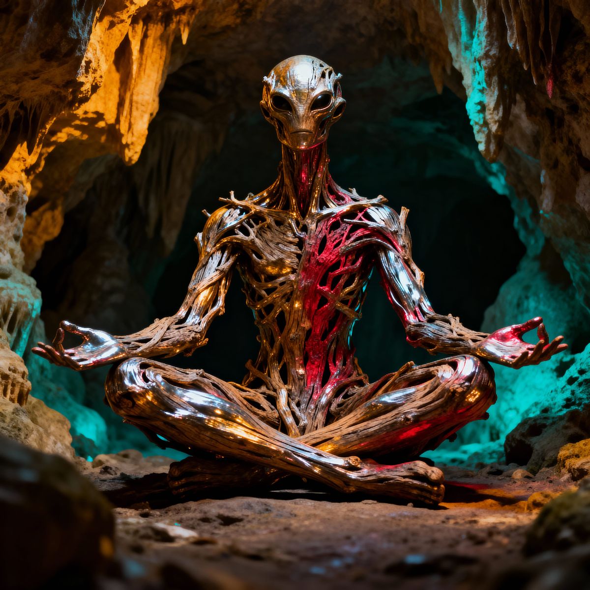 This image features a humanoid alien made of chrome wood-like branches, sitting cross-legged in a cave. Dramatic lighting and intricate details highlight its organic form, with a focus on amber, ruby, and teal colors.