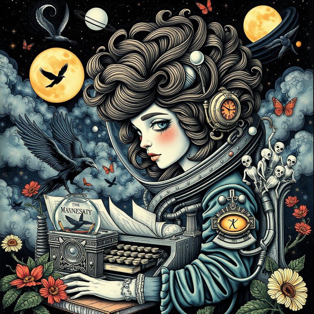 This vibrant, pop art-inspired image features a celestial cosmonaut with a bookish mind, surrounded by magical elements and a colorful, abstract background. The intricate details and dramatic lighting create a captivating scene that blends the styles of Nicoletta Ceccoli and Vincent van Gogh.