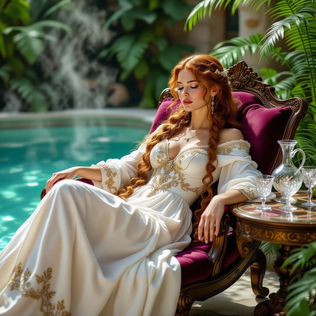 A serene portrait of a woman with auburn hair in a white and gold gown, relaxing in a medieval bath surrounded by ferns. The image is rendered with rich colors and delicate lines.