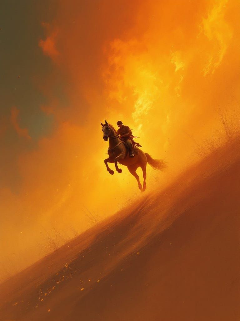 This image captures a horse running freely, rendered with dynamic graphic tension and a warm, limited color palette. It features luminous color gradients and visible brushwork, creating a radiant glow.