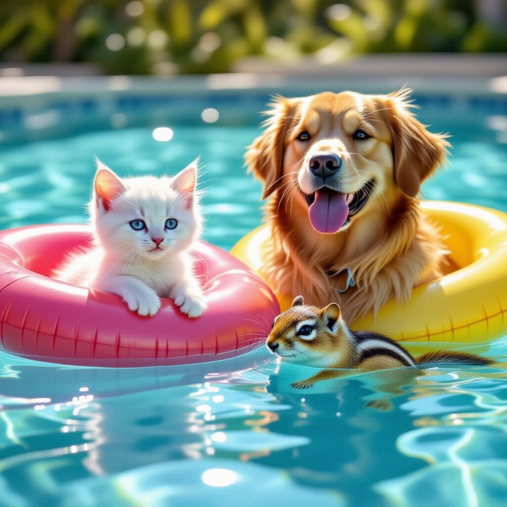This image shows a white kitten and golden retriever relaxing on inflatable tubes. A chipmunk rests nearby in the sunny scene with water reflections and textures, depicted with photorealistic rendering.