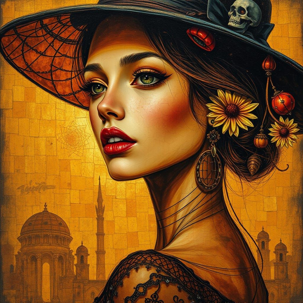 This image shows a dreamlike fusion of fashion and technology, featuring a cyber noir woman in a hat amidst a landscape of data strands, rendered in thick, textured encaustic impasto with a mix of warm, golden light and vibrant, earthy tones.