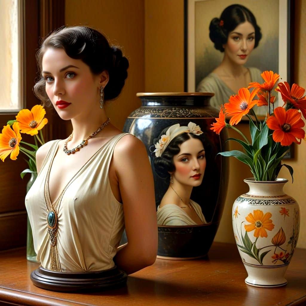 beautiful 1920s lady with fashion magazines, black and white photographs, exotic flowers in delicate vases, large stoneware jar by Catherine Hyde, Edward Hopper, Andrey Bobir, Serge Marshennikov, Natalia Drepina, Leonora Carrington, Amanda Clark, Salvador Dali, Cesar Santos, Gustav Klimt, William Oxer, ...