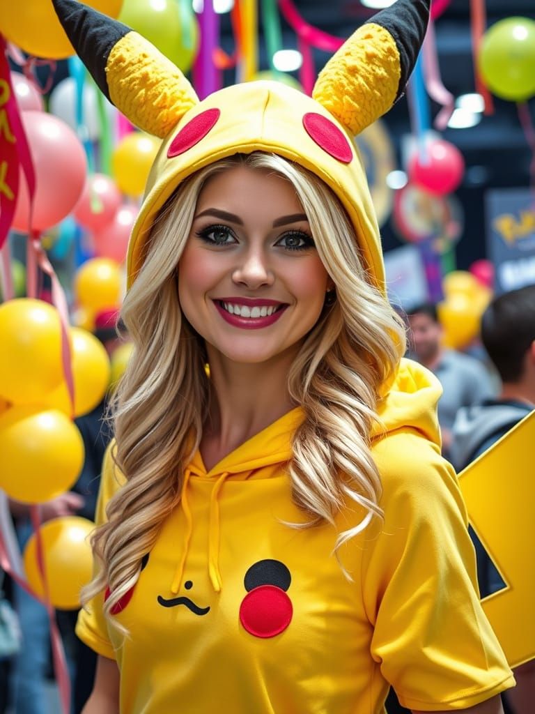 A photo of a blonde woman cosplaying as Mimikyu at Comic Con. The image has a playful atmosphere with vibrant colors and streamers, reminiscent of a professional celebrity portrait.