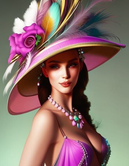 A close-up portrait of a woman wearing an elaborate floral hat with feathers. The image features dynamic lighting and a vibrant color palette, in the style of digital art.