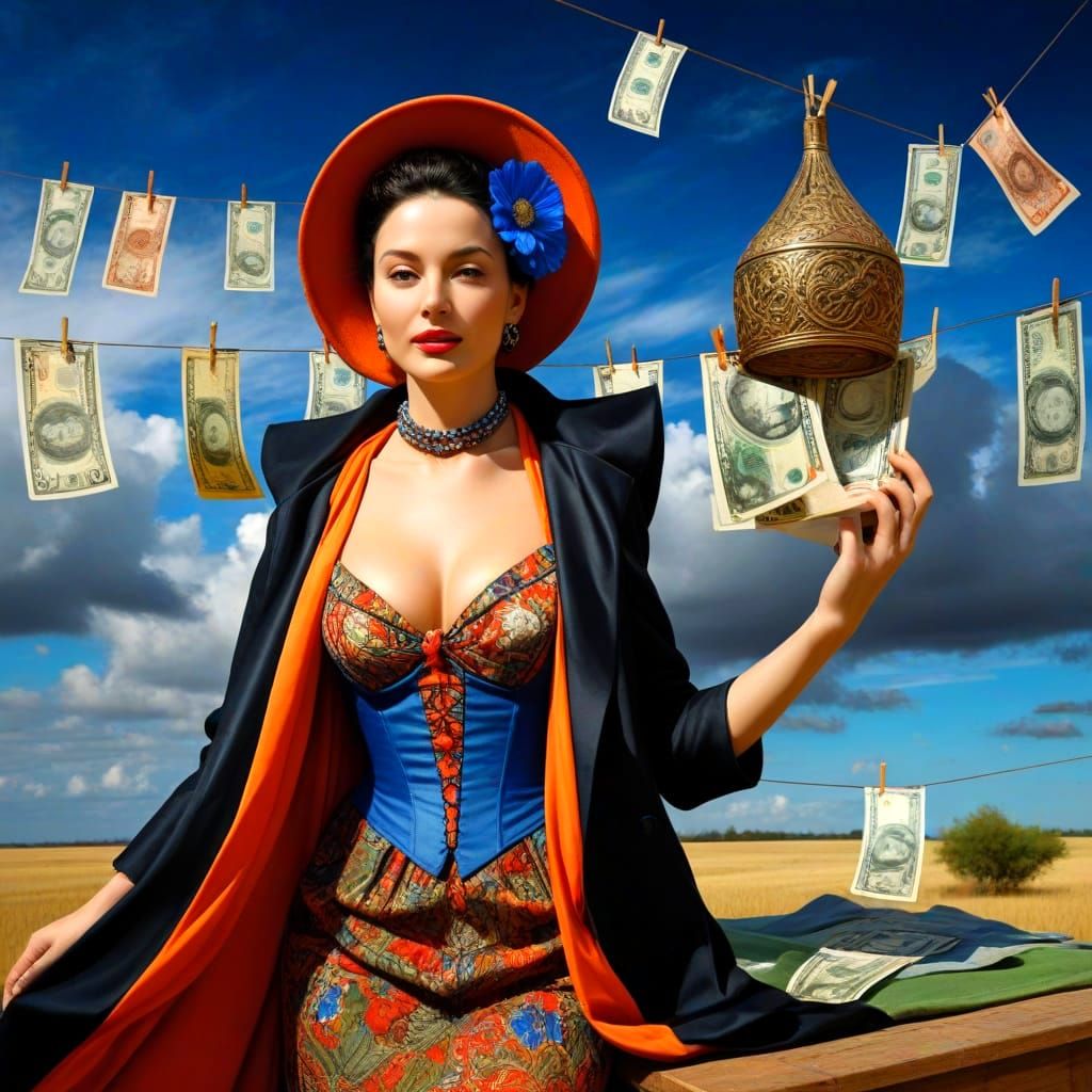 beautiful cheerful mature lady in exotic eccentric extravagant outfit hanging banknotes to dry on a laundry line, outlandishly flamboyant outfit, strange fantastic surreal outfit; professional photography by Chantal Convertini, Nathaniel Goldberg, Mario Testino, Julie Paisley, Cass Bradley, Ashley Fisher, ...
