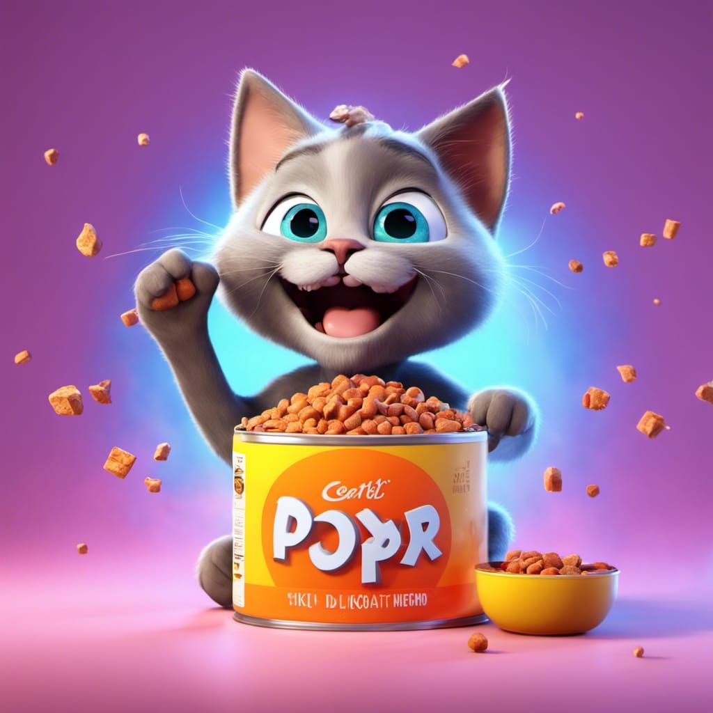 A happy cat sits next to a bowl of cat food. Rendered as 3D digital art, the image features bright colors and a radial gradient background.