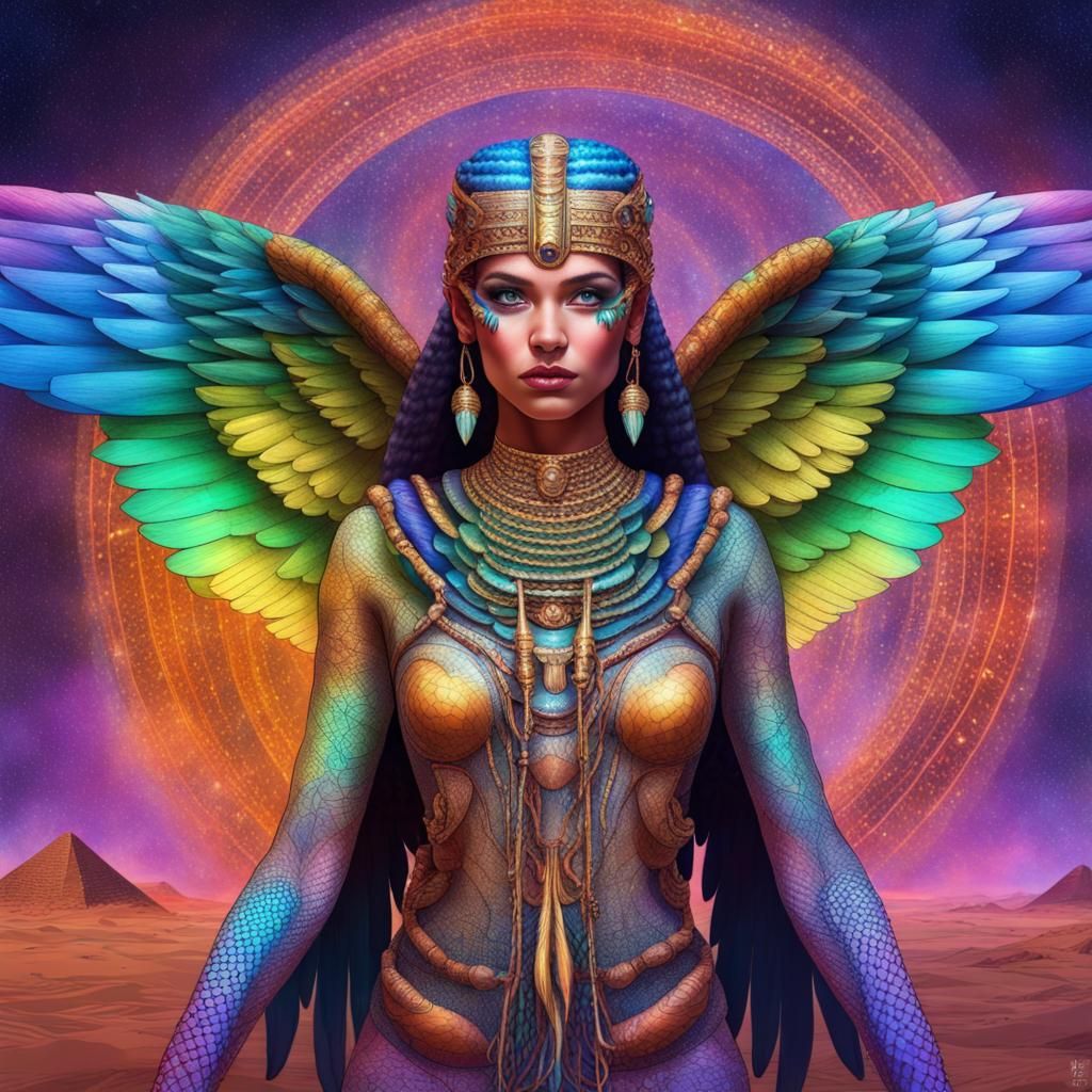 A vibrant image of a snake woman with feathered wings, adorned in Egyptian clothing. This astral illustration features cosmic elements and a holographic aesthetic.