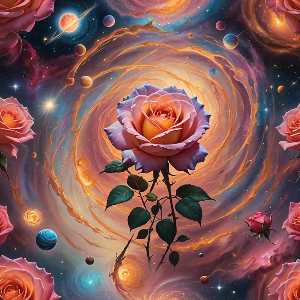A vibrant galaxy featuring a rose emitting sunlight, surrounded by orbiting planets. This image, with blended pastel colors, captures a fantasy concept as an 8k resolution matte painting.