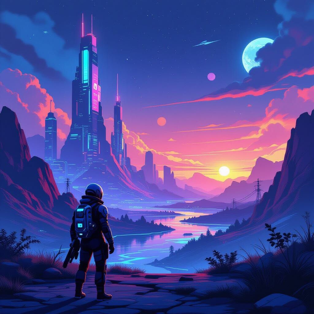This image shows vibrant video game covers featuring futuristic landscapes, neon lights, and dynamic characters, blending cyberpunk and science fiction elements in a digital art style.