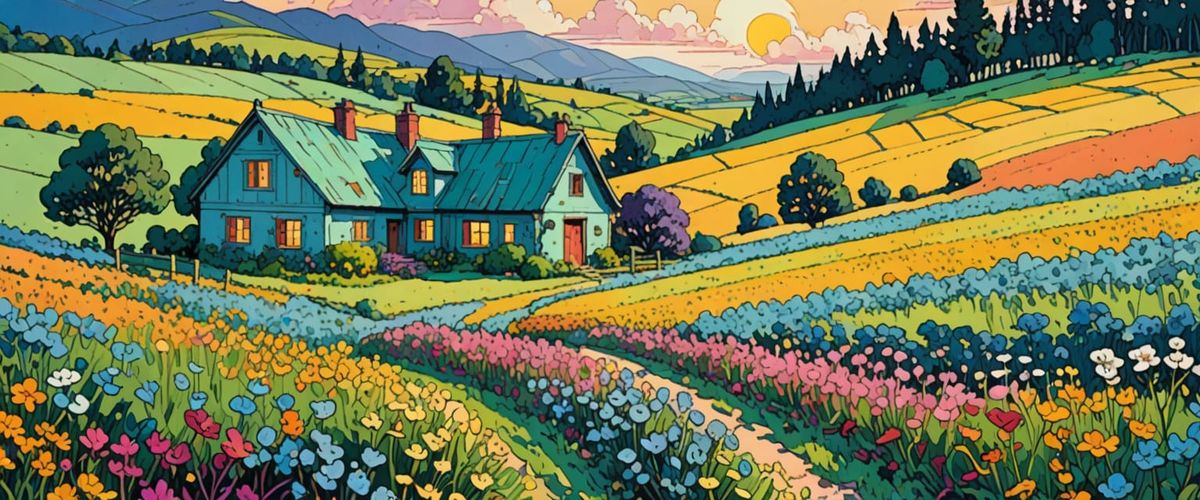 This image depicts a charming country farmhouse surrounded by a vibrant field of flowers, rendered in a retro comic book style with soft, pastel colors and dramatic lighting.