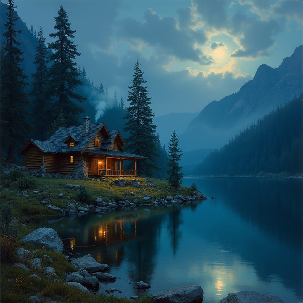 This enchanting scene depicts a peaceful mountain cabin by a serene lake at night, surrounded by majestic pine trees and bathed in soft moonlight, exuding a sense of tranquility and wonder