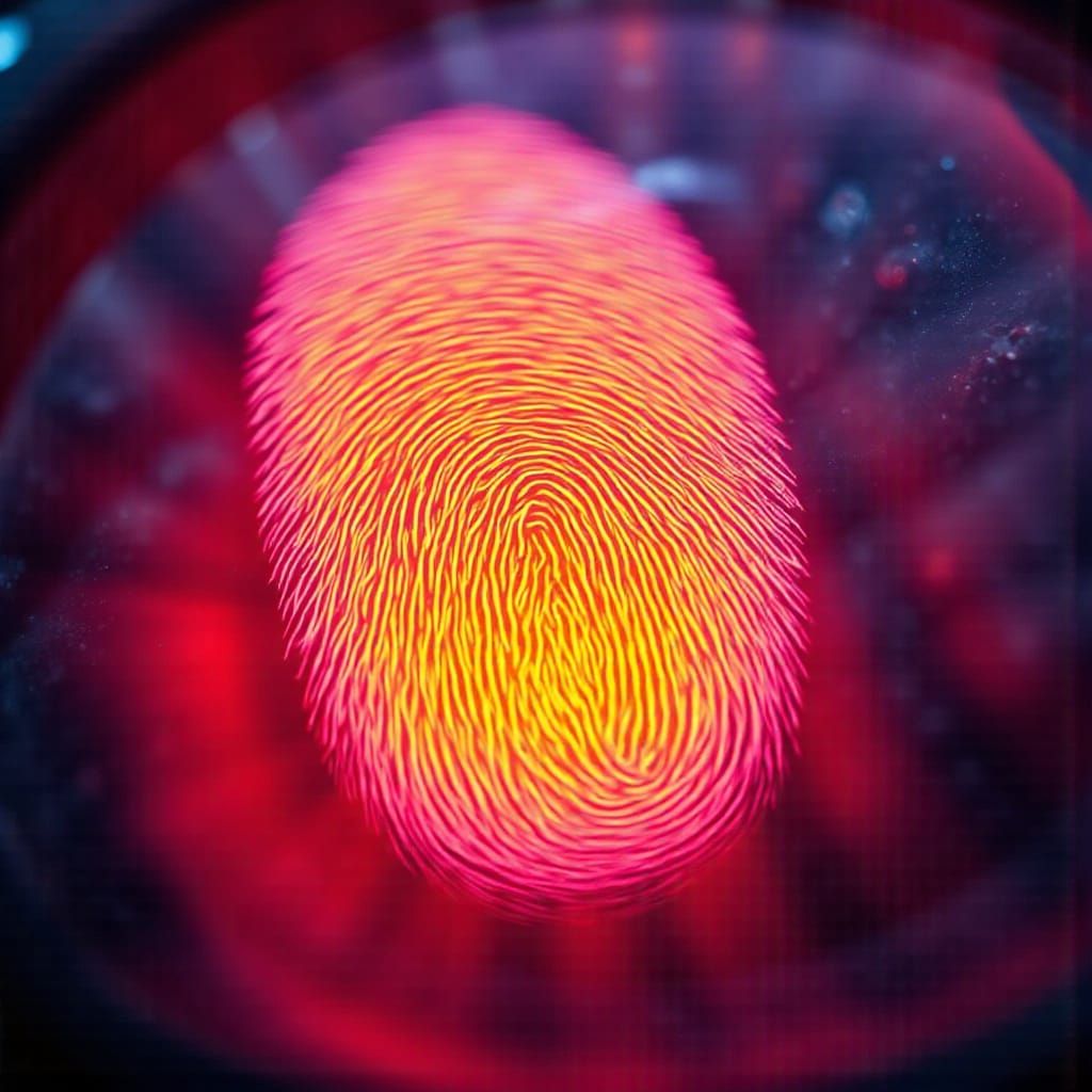 This image shows a highly detailed, extreme close-up of a human fingerprint. The image features vibrant colors, cinematic lighting and film grain, in a hyper photorealistic style.