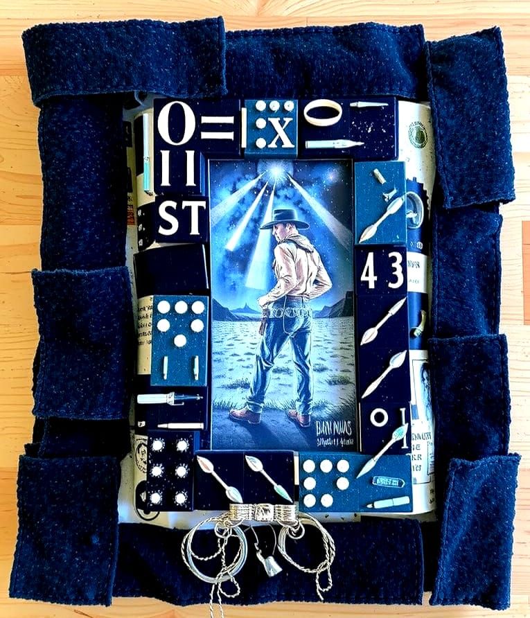 A striking picture of a cowboy in a desert landscape under a fiery, star-filled sky. The image evokes a sense of adventure and the rugged beauty of the Wild West.