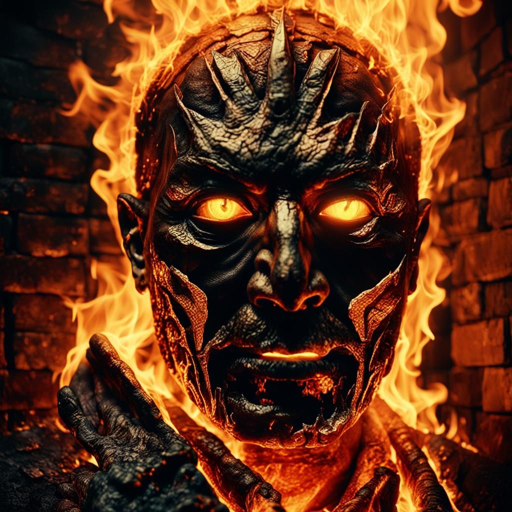A striking picture of a body embedded in a wall of fire. The image features intense heat distortions, ember glow, and a dark, ominous atmosphere in a cinematic style.