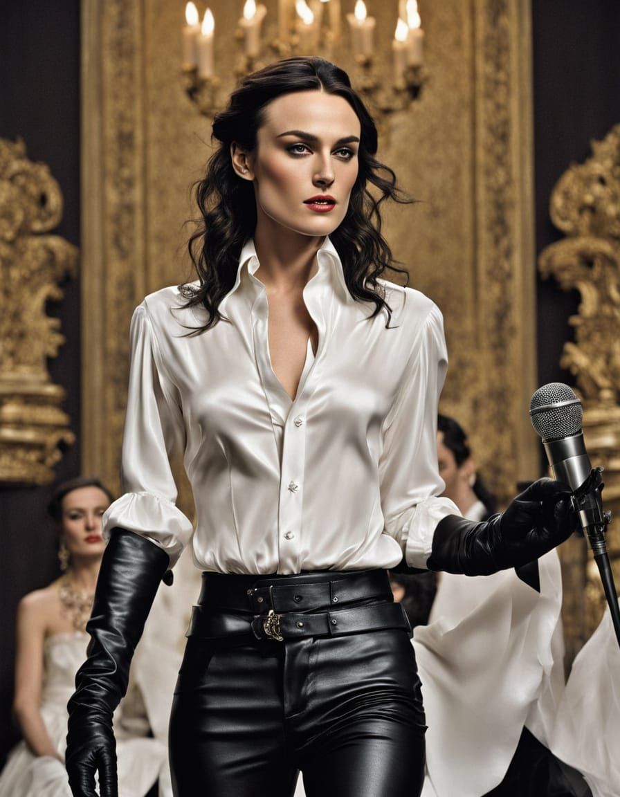 This image depicts a hyperrealistic portrait of a pop singer resembling Keira Knightley performing on stage. She is styled with a baroque updo, satin blouse, leather jeans and fingerless gloves.