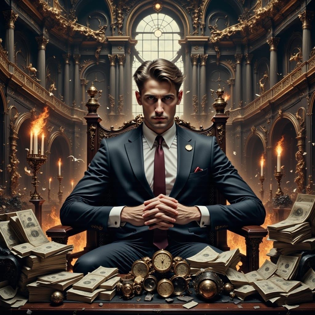 This image shows a greedy businessman in a luxurious, high-tech office filled with money. The artwork features a futuristic aesthetic reminiscent of Syd Mead and Simon Stalenhag.