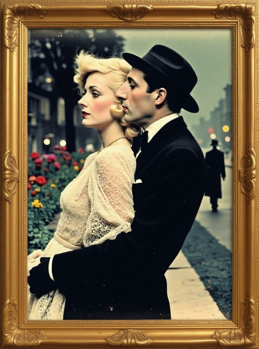 A vibrant fashion illustration reminiscent of René Gruau's iconic style. This artwork captures a love story with languid figures and bold lines, rendered with saturated colors.