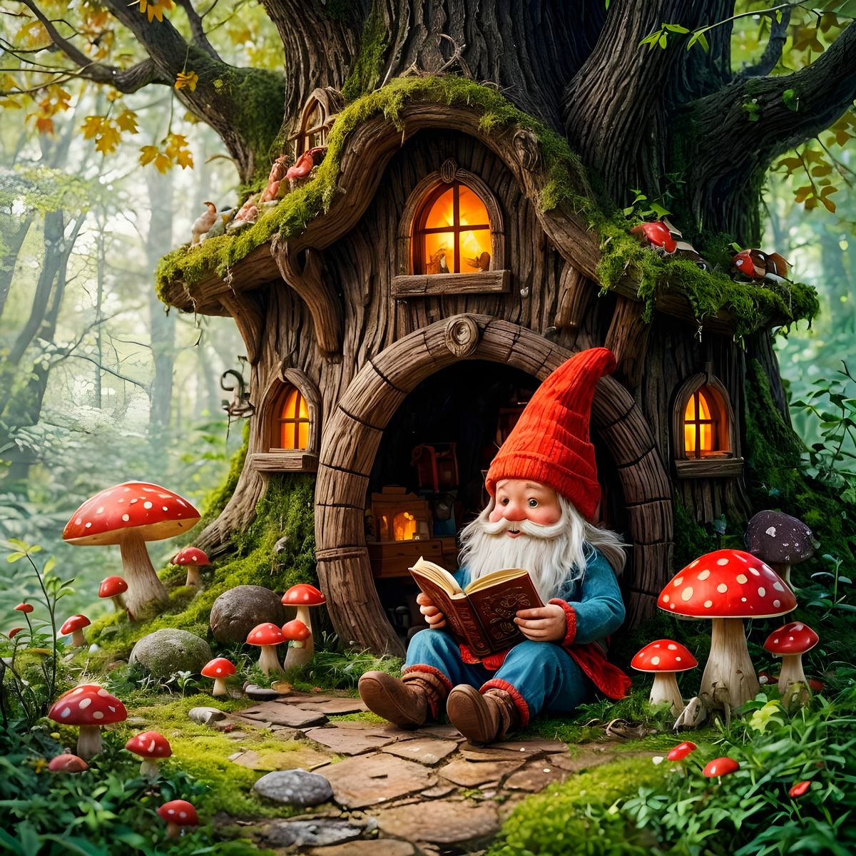 A charming image of an old treehouse surrounded by a mushroom forest. Sunlight streams through the trees, illuminating a gnome reading a book in this painterly, dreamlike scene reminiscent of vintage storybooks.