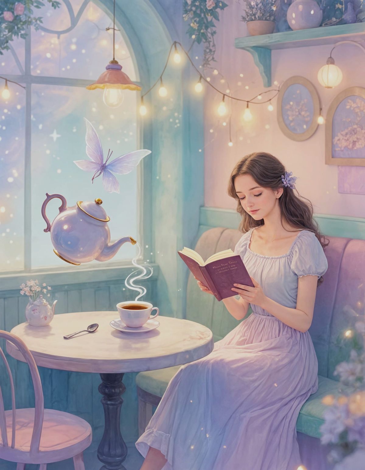 This image depicts a pale, pastel watercolor scene of a magical cafe. A relaxed woman reads as a teapot magically pours tea amidst sparkling lights.