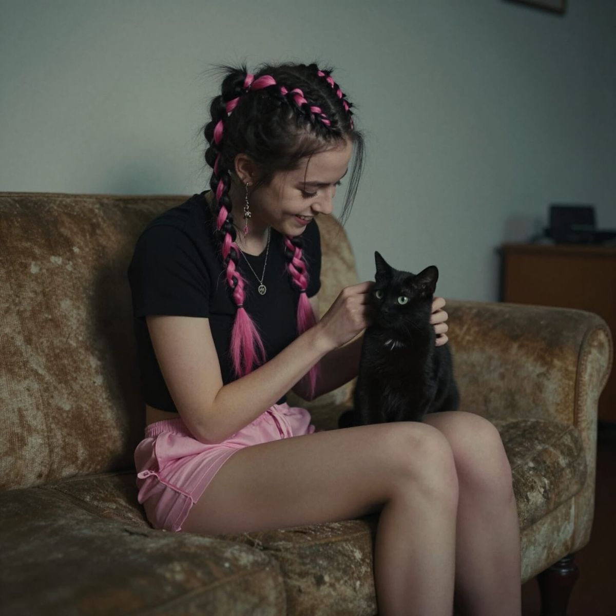 This image shows a punk girl with pink and black braided hair, wearing pajamas, petting a black kitten with green eyes on an old couch. Captured in a cinematic film still style with atmospheric lighting.