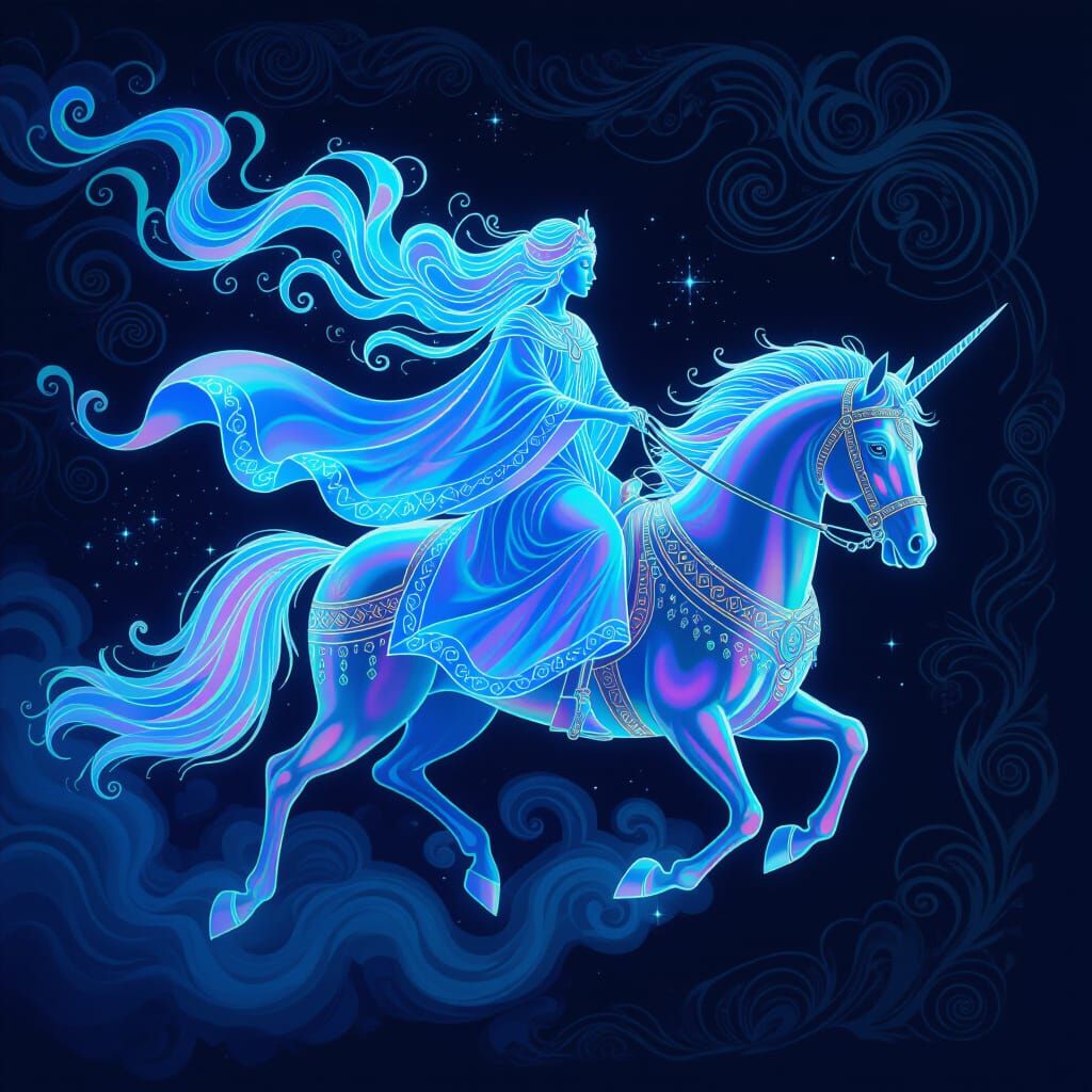 This image shows a steam wind figure in flowing robes riding a steam-powered horse against a dark background. The cosmic illustration features holographic elements and intricate swirling patterns.