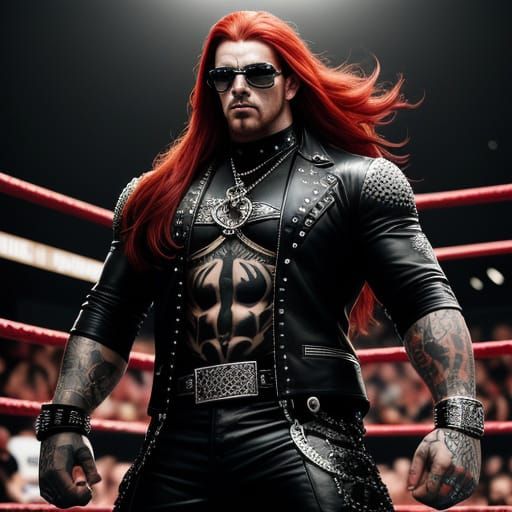 A close-up of a rugged male wrestler in a dark, gritty wrestling arena. He wears a black leather outfit with metallic studs and buckles, and his long red hair and tattoos are detailed in high contrast. His silver mirrored sunglasses reflect the bright lights, adding a touch of drama to the scene.