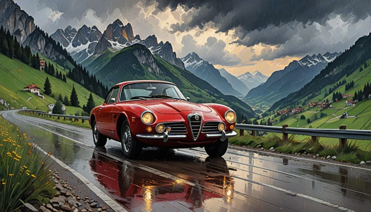 A striking picture of a red 1960s Alfa Romeo sports car driving through the Italian Dolomites. The wide-angle shot captures the car's position on the mountain road in rainy weather, as an impasto gouache painting.