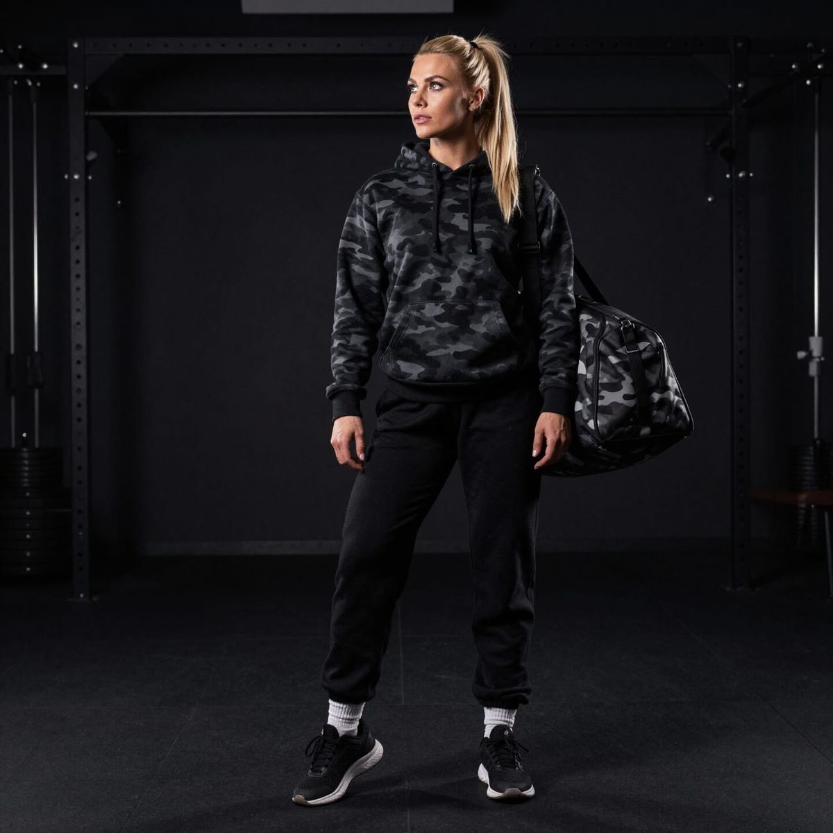 This photorealistic image depicts a powerful, athletic blonde woman in workout gear, standing in a dark gym. Cinematic lighting and dramatic shadows enhance the mood, ready for a demanding session.