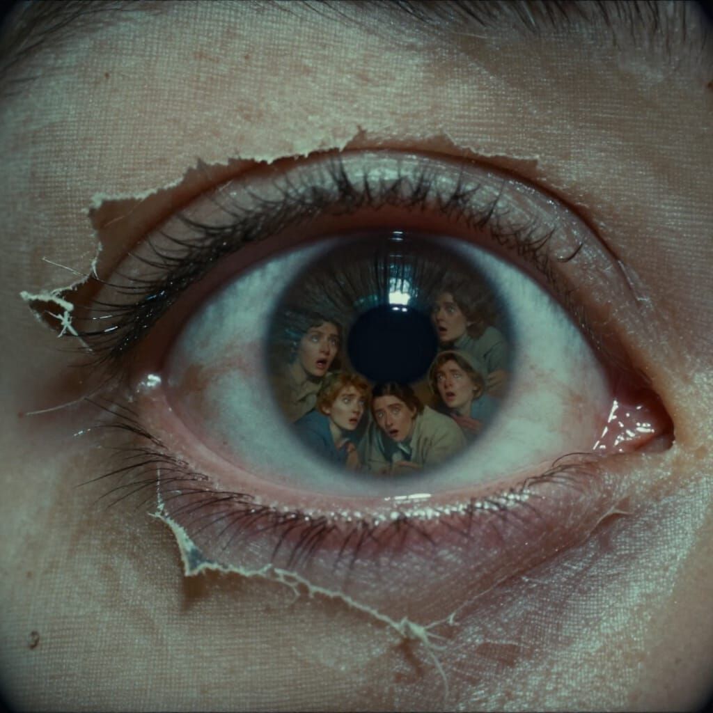 This cinematic image shows a colossal eye looking through torn fabric at tiny, fearful people. Captured with dramatic lighting and realistic detail, it evokes epic drama.