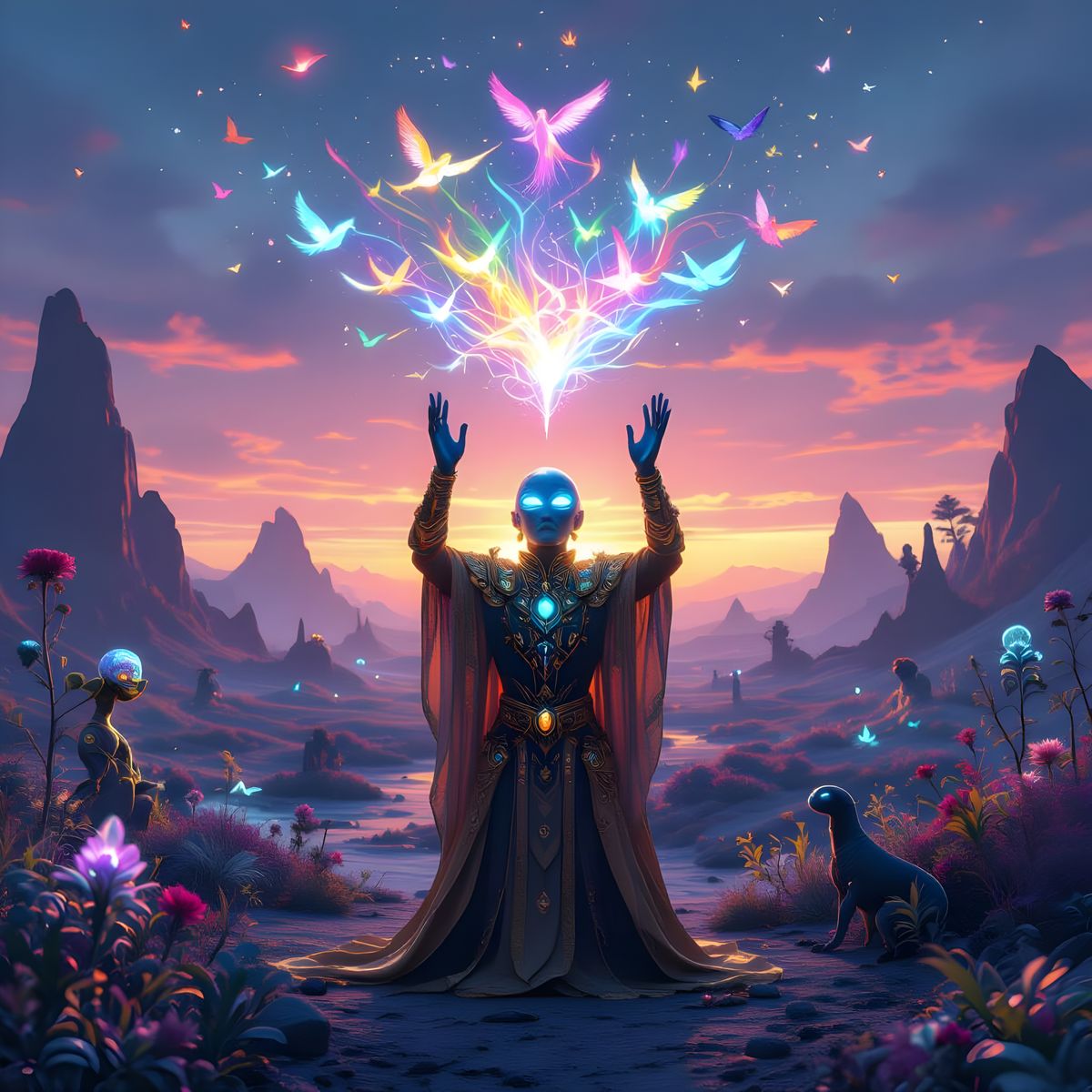 This image depicts an alien world at dawn. Strange, luminous flora and fauna awaken under a vibrant pink sky, with a richly adorned alien figure praying.