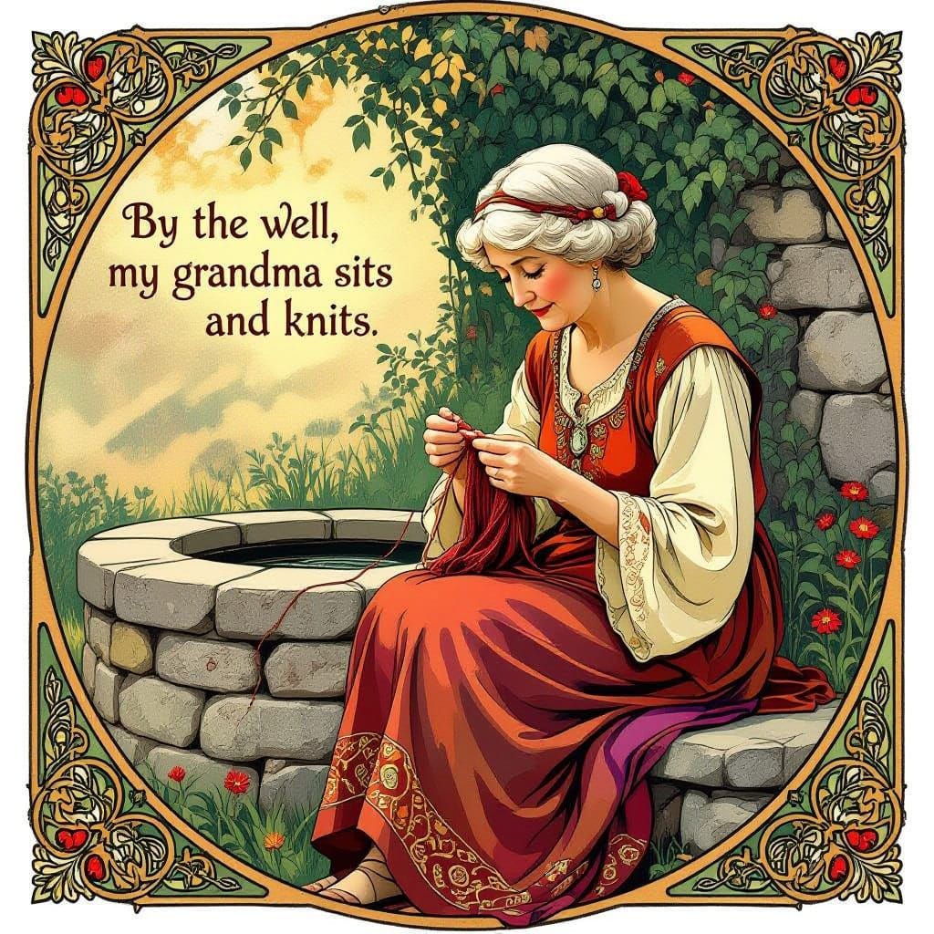 True story by my grandmother ❤️ "By the well, my grandma sits and knits, Click and flits, the yarn submits. Soft, deep colors, stories reside, In every stitch, love as her guide. Warmth she weaves with gentle hand, Sanja Zivkovic's loving stand."